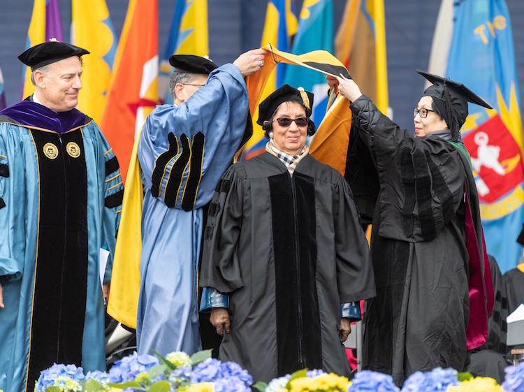 Ann Arbor, Mich., March 30, 2018 — An internationally renowned dental educator, academic leader and social justice advocate nominated by the School of Dentistry will receive an honorary degree from the University of Michigan at its spring commencement on April 28 at Michigan Stadium. Dr. Jeanne Sinkford in January 2016 delivering the annual Health Sciences MLK Lecture, which was hosted by the School of Dentistry at the U-M medical center. Jeanne Craig Sinkford is a professor and dean emerita of the Howard University College of Dentistry in Washington, D.C., and senior scholar-in-residence at the American Dental Education Association. When she was named dean of the Howard dental school in 1975, Dr. Sinkford was the first female dean of an American dental school. Dean Laurie McCauley and the dental school will host Dr. Sinkford during her visit to campus to receive a Doctor of Science degree during the commencement ceremony. The school also hosted Dr. Sinkford in 2016 when she delivered the annual Health Sciences MLK Day Lecture at the U-M medical center. Sinkford is a 1953 Phi Beta Kappa graduate of Howard with a degree in psychology and chemistry. She graduated first in her class at Howard’s College of Dentistry in 1958 and joined the school’s faculty in the Division of Prosthodontics. She later attended Northwestern University for a doctorate in physiology and post-graduate training in prosthodontics. She returned to Howard in 1964 to become chair of the Division of Prosthodontics. She became associate dean in 1967 and a full professor in 1968. During her tenure as dean, from 1975 through 1991, Sinkford expanded the research and community service components of dental education at Howard and nationally. Among other leadership roles, she chaired the Council of Deans of the American Association of Dental Schools and the Anatomical Review Board of the District of Columbia. Notable among her many honors is her election to fellowship in the National Academy of Medicine, formerly the Institute of Medicine. Photo Update to original story post: Dr. Jeanne Sinkford is hooded after receiving an honorary Doctorate of Science degree at the University of Michigan spring commencement on April 28, 2018, at Michigan Stadium. U-M Regent Andrew Richner (left) watches as William Ortega, chair of the Senate Advisory Committee on University Affairs, and vice chair Ruth Carlos place the hood.mmencement U-M presents honorary degrees to recognize those who have “advanced their field of endeavor in significant ways” or have made major contributions to society. For more information, see the story on this year’s honorary degrees on the University Record website. Visit Jeanne Sinkford’s biography on the Sindecuse Museum website. ### The University of Michigan School of Dentistry is one of the nation’s leading dental schools engaged in oral health care education, research, patient care and community service. General dental care clinics and specialty clinics providing advanced treatment enable the school to offer dental services and programs to patients throughout Michigan. Classroom and clinic instruction prepare future dentists, dental specialists, and dental hygienists for practice in private offices, hospitals, academia and public agencies. Research seeks to discover and apply new knowledge that can help patients worldwide. For more information about the School of Dentistry, visit us on the Web at: www.dent.umich.edu. Contact: Lynn Monson, associate director of communications, atdentistry.communications@umich.edu, or (734) 615-1971.