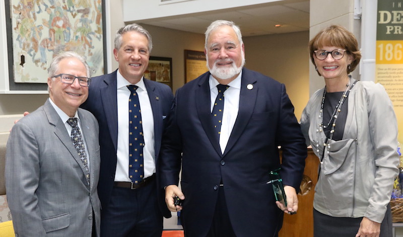 From left: Ken Kornman, adjunct faculty member; William Giannobile, chair of the Periodontics and Oral Medicine Department; Niklaus Lang; Dean Laurie McCauley. Ann Arbor, Mich., Sept. 25, 2018 -– Dr. Niklaus Lang is the inaugural recipient of the Distinguished Periodontics Alumnus Awardpresented by the Department of Periodontics and Oral Medicine at the School of Dentistry. Lang, who earned his master’s degree in periodontics at the school in 1975, received the award during a dinner at the school on Sept. 17. The event was jointly sponsored by the Osteology Foundation and the POM department as part of its third biennial Osteology Michigan-Harvard Research Academy. The new award recognizes an alumnus of the U-M graduate program in periodontics who has demonstrated distinguished accomplishment in the art and science of periodontology. The award will be given every third year and in the future will be named the Niklaus P. Lang Distinguished Michigan Periodontics Alumni Award. Lang has been a professor and honorary professor at universities around the world over five decades. He currently holds two positions at universities in Switzerland, as an honorary professor at the University of Zurich and as Professor and Chair Emeritus at the University of Bern. He has published more than 650 articles in peer-reviewed scientific journals and several textbooks, and has lectured on five continents. He founded the journal Clinical Oral Implants Research and served as its editor-in-chief for 26 years, until 2016. He is an honorary member of 17 national and international organizations, including the American Academy of Periodontology. In making the award presentation, William Giannobile, professor and chair of the Department of Periodontics and Oral Medicine, described Lang as one of the most distinguished graduates to ever walk the halls of the dental school. “If there was a Mt. Rushmore for outstanding periodontal leaders, Klaus would be on it,” Giannobile said. Lang was cited for advancing knowledge about periodontal diseases in areas such as diagnosis, etiology, pathogenesis, therapy and inter-disciplinary care in both periodontology and implant dentistry. “He has had a way of bringing together periodontology and prevention with reconstruction and clinical care,” Giannobile said. Presenters praised Lang’s work as a mentor for several generations of academicians and clinicians. In June, the European Federation of Periodontology recognized Klaus for his 50 years of contributions to the profession.