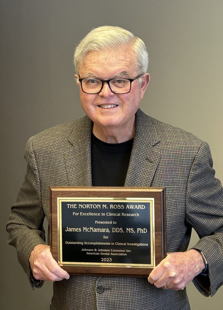 Ann Arbor, Mich., April 5, 2024 – School of Dentistry Professor Emeritus Dr. James McNamara will receive the prestigious Norton M. Ross Award for Excellence in Clinical Research from the American Dental Association at its annual session in October. Dr. McNamara is Professor Emeritus of Dentistry in the Department of Orthodontic and Pediatric Dentistry; Professor Emeritus of Cell and Developmental Biology in the U-M Medical School; and Research Professor Emeritus, Center for Human Growth and Development, an interdisciplinary research unit at U-M. Dr. James McNamara Presented annually since 1991, the Ross Award recognizes an individual who has made significant contributions in clinical investigations that have advanced the diagnosis, treatment or prevention of craniofacial, oral or dental diseases, as well as outstanding research endeavors in other areas. The award honors the memory of Dr. Norton Ross, a dentist and pharmacologist who spent most of his career in academic and research positions and elevated clinical research to higher scientific standards. McNamara is only the second orthodontist to receive the ADA award in the 32 years since its inception. His selection was announced last year as the 2023 Ross Award, but scheduling conflicts did not allow it to be presented until later this year at the ADA’s SmileCon annual conference, set for Oct. 17-19, 2024, in New Orleans, Louisiana. Based on his 55-year career combining academics and private practice, McNamara is being recognized for his research on orthodontics and craniofacial development. Long considered an innovator in orthodontic diagnosis and treatment, McNamara’s research has focused on the clinical modification of the growth of the face and jaws. He has more than 340 publications in peer-reviewed journals and has written, edited or contributed to 83 books, including his textbook “Orthodontics and Dentofacial Orthopedics,” which is used around the world. He also has given lectures or taught courses in 48 countries. McNamara has received numerous awards and honors, including the Lifetime Achievement Award for Orthodontic Research from the American Association of Orthodontics in 2021. In 2008, the American Board of Orthodontics presented him with the Albert H. Ketcham Memorial Award, generally considered the most prestigious award in orthodontics worldwide. In 2018, the orthodontics department at the U-M School of Dentistry held a tribute to McNamara at the conclusion of the annual Moyers Symposium, which McNamara coordinated for much of its 50-year existence. Orthodontics residents and alumni, fellow faculty and other colleagues from locally to internationally, cited McNamara’s unselfish sharing of knowledge with everyone within the global orthodontics community, from students and fellow faculty to researchers around the world to companies developing products – basically anyone working to advance orthodontics. The Journal of Clinical Orthodontics published a lengthy, two-part interview with McNamara in its September and October 2014 issues that chronicled his journey from primate research in the early part of his career to working with experts around the world on craniofacial growth and the continually-evolving orthodontic techniques that became the standards of the profession. His history is filled with names and orthodontic terms like the Fränkel and Herbst appliances, the orthopedic facial mask, bone-plate therapy, the bonded acrylic splint expander, the Pendulum appliance and rapid maxillary expansion, to name a few. McNamara’s career led the journal’s editor to describe him as “the world’s leading authority in early and mixed-dentition orthodontic treatment.” In a 2018 interview in the School of Dentistry alumni magazine, McNamara was asked why he hadn’t been content to be an orthodontist who mainly focused on private practice. Why had he instead committed to adding decades of advanced research and teaching to his private practice career path. “I’m curious,” he said. “That’s really the two-word answer to that question. I always wanted to know more.” The Ross Award is one of the premier awards presented by the ADA, the nation’s largest dental association with nearly 160,000 members. Founded in 1959 to support the dental profession and the advancement of public health, the organization addresses crucial issues such as access to care and the regulations that surround the practice of dentistry. ### The University of Michigan School of Dentistry is one of the nation’s leading dental schools engaged in oral healthcare education, research, patient care and community service. General dental care clinics and specialty clinics providing advanced treatment enable the school to offer dental services and programs to patients throughout Michigan. Classroom and clinic instruction prepare future dentists, dental specialists and dental hygienists for practice in private offices, hospitals, academia and public agencies. Research seeks to discover and apply new knowledge that can help patients worldwide. For more information about the School of Dentistry, visit us on the Web at: www.dent.umich.edu. Contact: Lynn Monson, associate director of communications, at dentistry.communications@umich.edu, or (734) 615-1971.