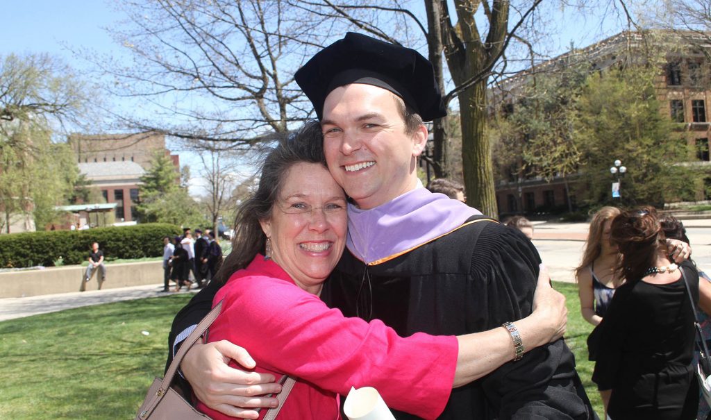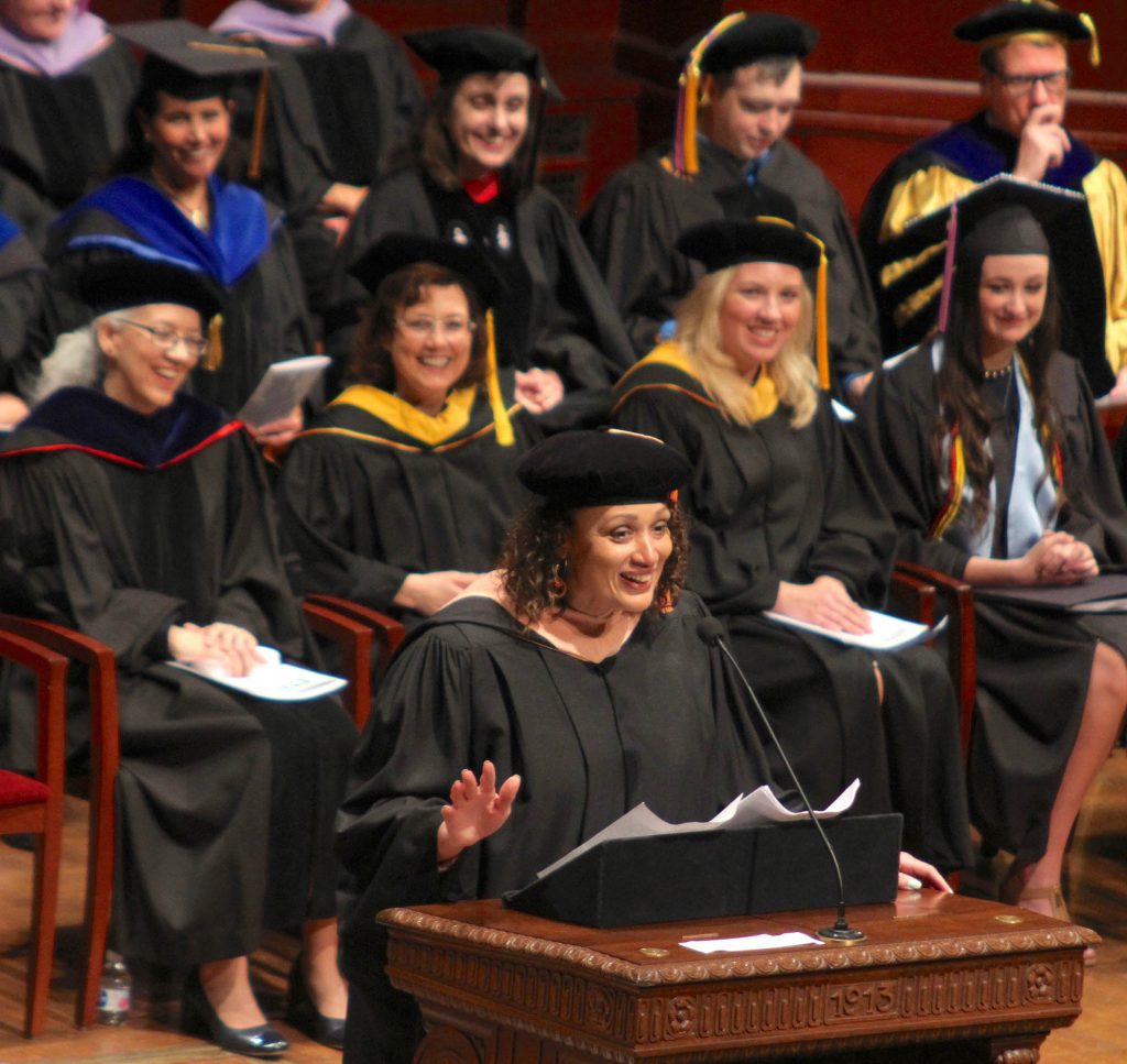 DDS, Dental Hygiene and graduate degrees celebrated at Hill Ann Arbor, Mich., May 8, 2018 -– School of Dentistry graduates left their commencement ceremony Friday at Hill Auditorium with more than degrees focused on the oral health of their patients; they also carried with them the responsibility of leadership and public service for the greater good of their communities. That was a common message emphasized by speakers as the school presented 130 Doctor of Dental Surgery degrees, 39 Bachelor of Science in Dental Hygiene degrees, one Doctor of Philosophy in Oral Health Sciences degree and 29 Master of Science degrees in Dental Hygiene, Endodontics, Orthodontics, Pediatric Dentistry, Periodontics, Prosthodontics and Restorative Dentistry. Dean Laurie McCauley said the ceremony celebrates the graduates’ decision to pursue a career that will significantly improve the lives of thousands of people in their work as dentists, dental hygienists, researchers and educators. “We also celebrate your ability to reach the finish line – your ability to push through the hard work, the grueling study sessions, the micro details that your professors demanded,” McCauley said. “We couldn’t teach you the answer to every possible dilemma you will encounter, but we’re confident that we’ve prepared you to think, to collaborate and to lead the way to the best solution to whatever challenge you encounter along your path.” Tonya Allen draws laughs with an anecdote during hercommencement address. In introducing commencement speaker Tonya Allen, McCauley noted that Allen is “a shining example of how one person can make a difference in a community.” Allen, president and chief executive officer of The Skillman Foundation in Detroit, has a long list of accomplishments as a civic leader and social justice advocate. The foundation she leads works to ensure that the youth of Detroit have access to high-quality educational and economic opportunities. Allen told graduates they are a “new tribe” ready to be change agents and leaders wherever they may go with their careers. “You ought to be excited, you ought to be exhilarated, you ought to be exhausted, and you ought to be ready to change the world,” she told them. “That’s exactly what all of us in this room are expecting of you. We’re ready for you to take on the world.” Allen listed five rules for being part of the new tribe: Know your DNA; make leadership your cultural norm; develop problem-smashing audacity; understand the importance of risk, urgency and momentum; and be persistent. The first step is to know yourself and your particular purpose, Allen told graduates, adding, “Stop trying to fit in and start trying to stand out.” She said a good leader is about being the change rather than asking others to change. “Understanding the burden of citizenship – what is not your fault is still your responsibility – will change your perspective,” she said. U-M Regent Andrew Richner urged graduates to“use your world-class Michigan education andcan-do attitude to model the MichiganDifference and make your own transformativecontributions to the field of dentistry.” Allen said audacity is a boldness, a willingness to confront problems without restraint while understanding that change comes from persuasion rather than force. Solving problems involves curiosity, questioning, probing, uncovering, connecting, listening and engaging others, she said. Engaging in societal issues requires risk, urgency and momentum, particularly in contentious times when it might seem easier to stay out of the fray. “Make sure you are pushing toward the kind of change you believe this world deserves,” she said. “We need you to act … to be deeply imbedded in communities and knowing that everything you do matters.” Allen said the most important quality is persistence, quoting the adage that “a river cuts through rock not because of its power but because of its persistence.” “We are waiting on you to unleash your greatness, your power and your contribution – to your patients, to your families and to our society,” Allen said. Dental Hygiene Senior Class President Tristan Clark (left)hugs faculty member Iwonka Eagle, recipient of theSenior Class Faculty Award. Tristan Clark, president of the Dental Hygiene senior class, said that pursuing her education at U-M changed her life. “Coming to this university has forced me out of my comfort zone and taught me to not be afraid of failure,” she said. “It is because of this that I was truly able to find myself and grow as a person. It is here that I learned that I – just like all of us graduating today – can do anything we set our minds to.” Clark reflected on what it means to graduate from the top dental school in the nation at a university that cites “The Michigan Difference.” “At first, I thought it meant impossible exams and having a 93 percent be a B-plus,” she said. “But then, I took a moment to reflect and thought back to something that I was told at orientation and that has always stuck with me. When entering this program, we were told that although perfection is impossible, it was expected. To me this is The Michigan Difference. It is to strive for the impossible and to truly be the leaders and the best in our fields.” Clark introduced the Dental Hygiene Faculty Award, describing clinical lecturer Iwonka Eagle as a faculty member with unending patience when students struggled with both basic skills in their early classes and with the more complex and intimidating procedures throughout their three years in the program. Eagle acknowledged the difficulties of clinical requirements, proficiencies, test cases, exams and group projects, but said that makes the students’ graduation all the more impressive. “What we have given you at the University of Michigan is a solid foundation, but you will learn so much more working in the real world,” she said. “You will, w